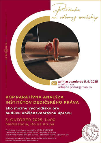 Katedra historického práva a právnej metodológie zorganizovala v októbri odborný workshop na tému ,,Komparatívna analýza inštitútov dedičského práva ako možné východisko pre budúcu občianskoprávnu úpravu". Hlavnou organizátorkou bola prof. JUDr. PhDr. Adriana Pollák, PhD. Podujatia sa zúčastnila aj JUDr. Katarína Valová, PhD., členka prezídia Notárskej komory SR. Predmetom diskusie bola pripravovaná kodifikácia Občianskeho zákonníka, konkrétne jeho časti o dedení, a inšpirácia z právnych úprav regulujúcich dedenie na našom území v historickom priereze. Stretnutie kolegov zo Slovenska a Česka sa konalo neďaleko Trnavy, v priestoroch Medolandie v Dolnej Krupej.