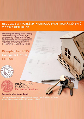 Septembrová prednáška Mgr. Karla Šemíka, doktoranda Právnickej fakulty Karlovej Univerzity v Prahe a sudcu Okresného súdu v Ústí nad Labem, sa zameriavala na viaceré aspekty krátkodobých nájmov bytov, ktoré sú sprostredkované cez Airbnb či Booking.com. Jedným z problémov tejto praxe je jej vplyv na susedské vzťahy a obmedzené možnosti súkromnoprávnej regulácie takýchto činností zo strany spoločenstiev vlastníkov jednotiek (bytov) vo svetle aktuálnej judikatúry Najvyššieho súdu ČR. Živá diskusia o hraniciach ochrany súkromia a osobných údajov vo vzťahu k štátu nadväzovala na nariadenie EU 2024/1028 o zbere a poskytovaní údajov týkajúcich sa služieb krátkodobého prenájmu ubytovania, najmä v súvislosti s plánovaným zavedením databázy ubytovaných hostí „eTurista" a možnosťami samosprávy zavádzať reguláciu tohto typu ubytovania. Aj z debaty vyplynulo, že koncept krátkodobého ubytovávania sa musí postupne pripraviť na vyššiu mieru regulatívnych zásahov aj tam, kde špecifická úprava zatiaľ nejestvovala. Prednesené tézy boli preto nanajvýš podnetné aj pre slovenské právne prostredie.