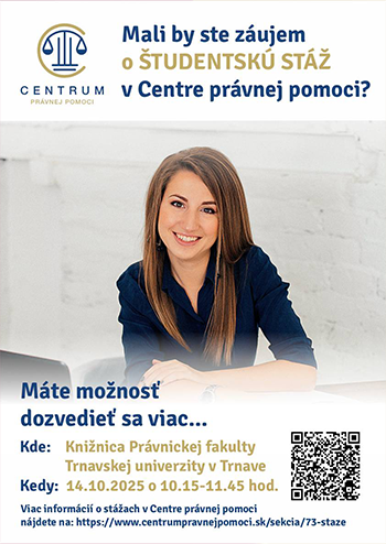 Dňa 14. októbra 2025 sa na fakulte konalo stretnutie zástupcov Centra právnej pomoci so študentmi. Podujatie otvorila riaditeľka Centra právnej pomoci, JUDr. Anna Peťovská, PhD. Ďalší prítomní boli Ing. Silvia Vojsová - vedúca odboru stratégie a riadenia projektov, Mgr. Peter Danišik – vedúci kancelárie Nitra, Mgr. Kamila Brázdovičová – zástupkyňa vedúcej kancelárie Trnava a Mgr. Ľuba Boľvanská - metodička Centra právnej pomoci.