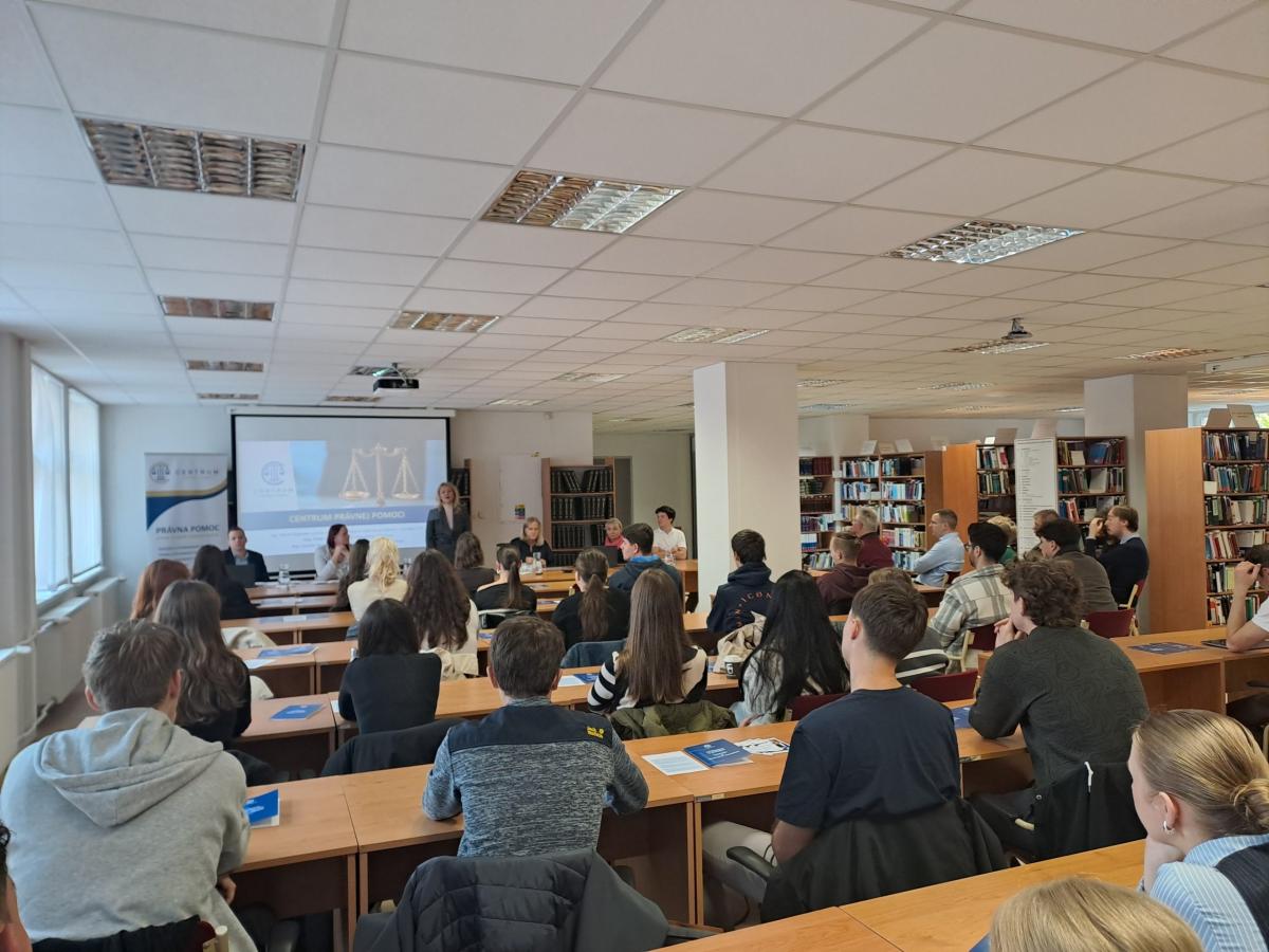 V rámci podujatia bola predstavená právna stránka poskytovania pomoci, vecná pôsobnosť Centra právnej pomoci a možnosti stáží pre našich študentov. V rámci tejto časti podujatia vystúpil náš študent, Samuel Jehlár, s jeho osobnou skúsenosťou v nitrianskej kancelárii, v rámci ktorej priblížil aj edukatívny rozmer tejto stáže pri konzultácii s klientmi.
